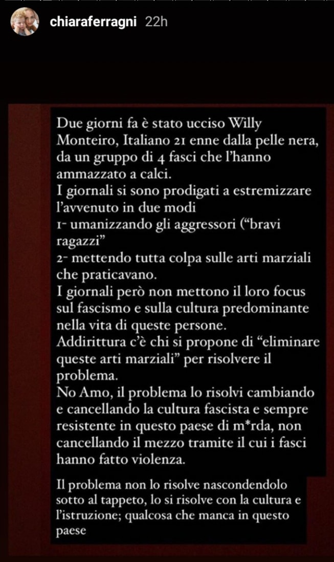 «Mi spiace che oltre alla sofferenza dobbiate subire anche queste cose». Lo ha scritto Chiara Ferragni in un post, rivolgendosi alla famiglia di Willy. Poi ha condiviso il post dell’account @spaghettipolitics sulla brutale uccisione a calci e pugni del giovane 21enne Willy Monteiro nella notte tra sabato e domenica.