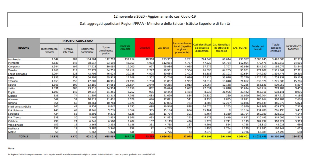 Coronavirus in Italia, il bollettino del 12 novembre: +636 morti per Covid