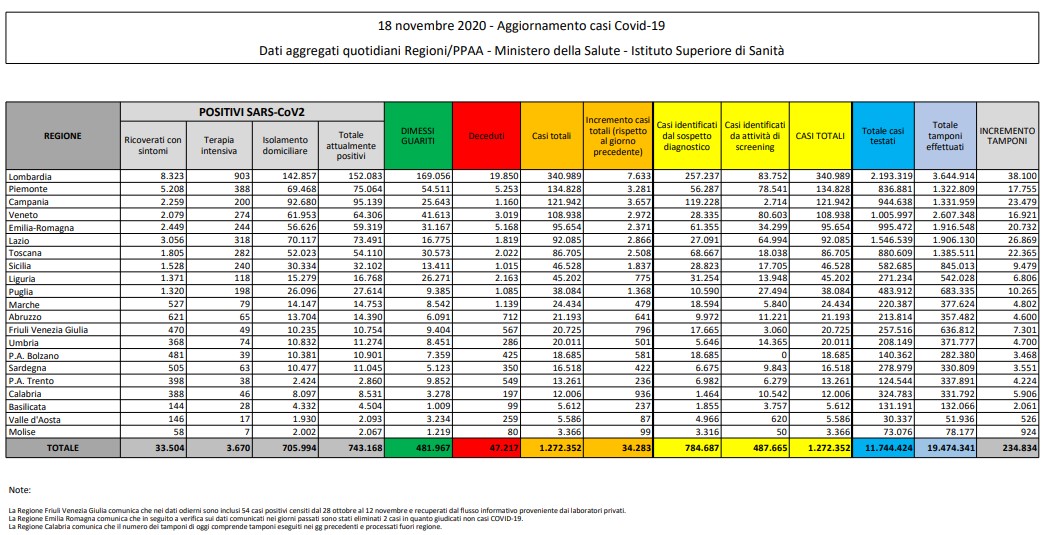 Coronavirus in Italia, il bollettino del 18 novembre: +753 morti per Covid