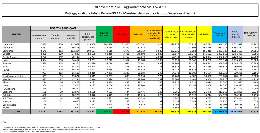 Inoltre vi è stato un calo di -9 persone nelle terapie intensive. Riparte a crescere invece il numero dei ricoveri, +308 da ieri a oggi. Contemporaneamente, sale il numero dei guariti, 23.004  (+9.362 rispetto ai dati del 29 novembre).