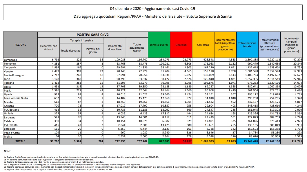 Contemporaneamente, sale il numero dei guariti, 25.576 (+2.102 rispetto ai dati del 3 dicembre).