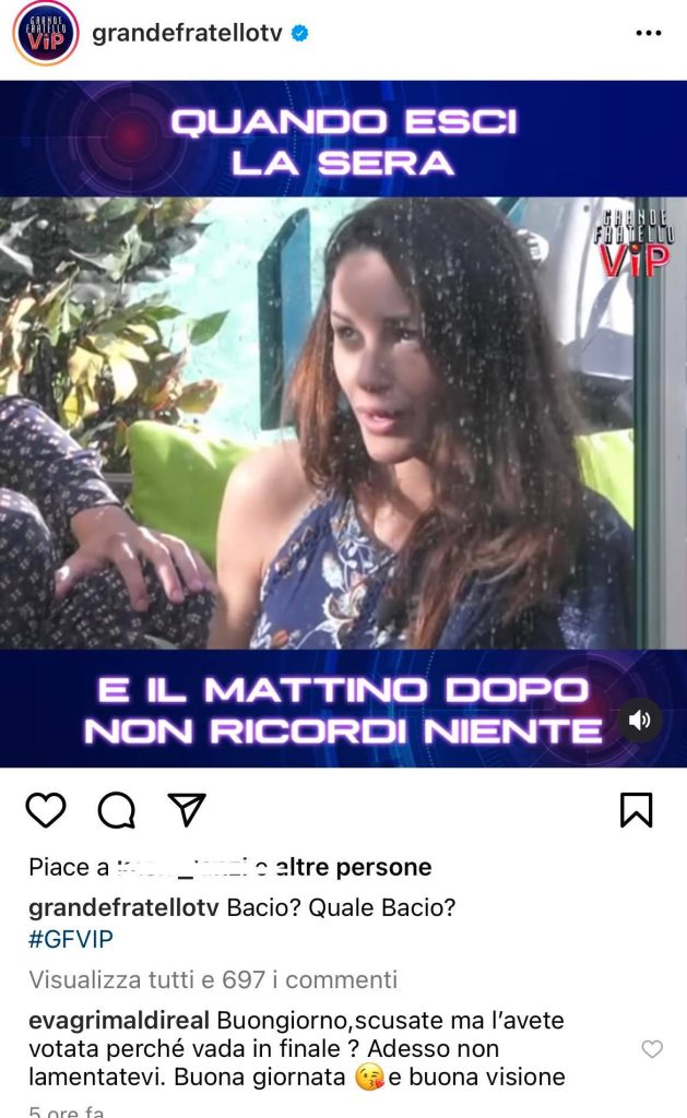 L’ex gieffina Eva Grimaldi di conseguenza è intervenuta proprio sul video condiviso dell’account ufficiale di Instagram del Grande Fratello Vip. La Grimaldi ha commentato il video invitando il pubblico che ha votato Delia mandandola fin da subito in finale a non lamentarsi delle dichiarazioni che rilascia e dai comportamenti della gieffina in Casa. Eva Grimaldi scrive: “Buongiorno, scusate ma l’avete votata perchè vada in finale? Adesso non lamentatevi. Buona giornata e buona visione”.
