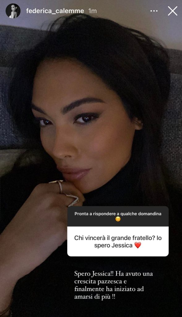 Un utente ha chiesto a Federica: “Chi vincerà il Grande Fratello?”, la modella ha risposto: “Spero Jessica! Ha avuto una crescita pazzesca e finalmente ha iniziato ad amarsi di più”. Inoltre riguardo Lulù ha affermato: “Lulù dice sempre quello che pensa, fa benissimo!!! Super vera”.