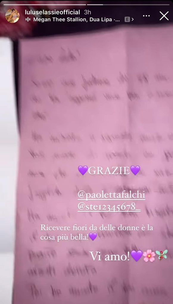 Le tre princess stanno lavorando su nuovi progetti e ben presto stupiranno tutti con tantissime novità esclusive. Nel corso della sua avventura nella Casa di Cinecittà, Lulù ha intrapreso una storia d’amore con l’atleta Manuel Bortuzzo. La loro relazione si è conclusa lo scorso aprile, e l’ex gieffina è stata inondata di affetto e supporto da parte dei fan. Ogni giorno Lulù riceve fiori, sorprese e lettere da parte delle sue fatine, anche in questa semplice giornata, Lulù ha ricevuto una lunghissima lettera da due fan, l’ex gieffina nel ringraziarle ha aggiunto: