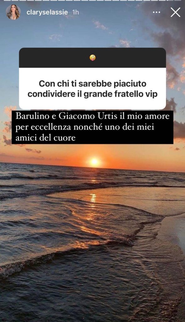 Nelle ultime ore Clarissa nelle sue stories Instagram ha risposto alle numerose domande dei fan poichè era da un pò che non lo faceva. Tra le tante domande e curiosità non sono mancate quelle riguardante il Grande Fratello Vip, un fan chiede: “Con chi ti sarebbe piaciuto condividere il Grande Fratello Vip?”, Clarissa ha risposto: “Barulino e Giacomo Urtis il mio amore per eccellenza nonchè uno dei miei amici del cuore”.