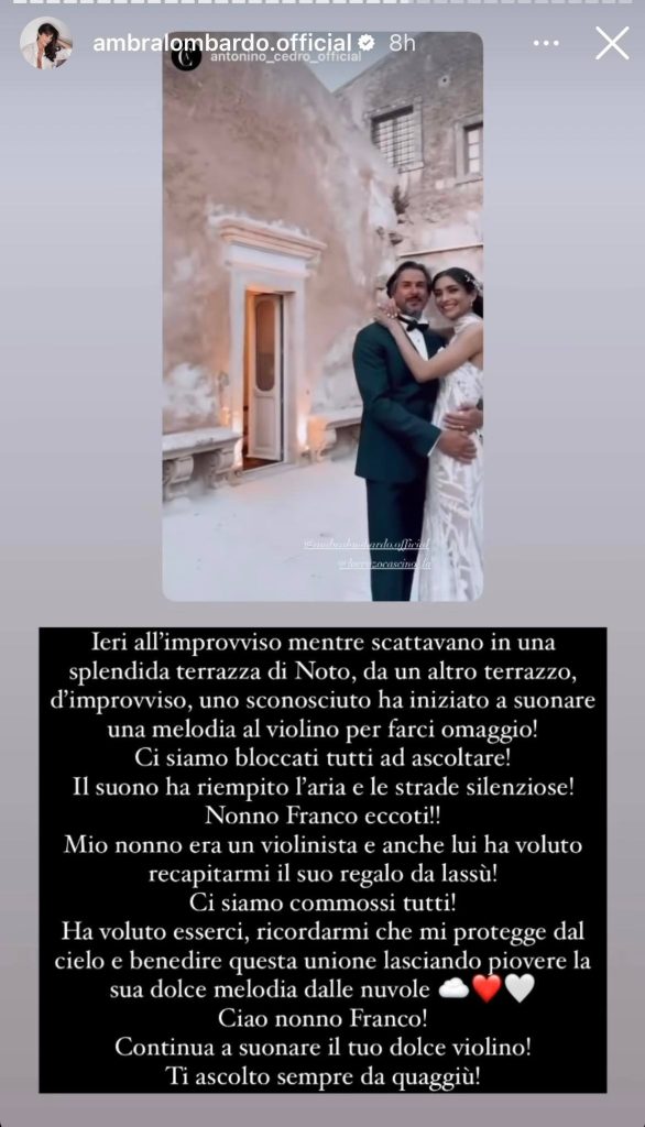 Nelle ultime ore ha condiviso con i suoi tantissimi fan che la seguono e l’ammirano uno scatto inedito del suo matrimonio aggiungendo come didascalia: “Vi racconto la felicità”. Il post social su Instagram è stato così inondato di messaggi di affetto e di auguri da parte dei tantissimi fan e non solo, anche da diversi personaggi dello spettacolo. Tra le stories Instagram invece ha condiviso tantissimi momenti della cerimonia e dei preparativi dove ha riportato anche un aneddoto accaduto durante il momento delle fotografie, Ambra scrive: “Ieri all’improvviso mentre scattavamo in una splendida terrazza di Noto da un altro terrazzo d’improvviso, uno sconosciuto ha iniziato a suonare una melodia al violino per farci un omaggio! Ci siamo bloccati tutti ad ascoltare. Il suo ha riempito l’aria e le strade silenziose! Nonno Franco eccoti. Mio nonno era un violinista e anche lui ha voluto recapitarmi il suo regalo da lassù”.