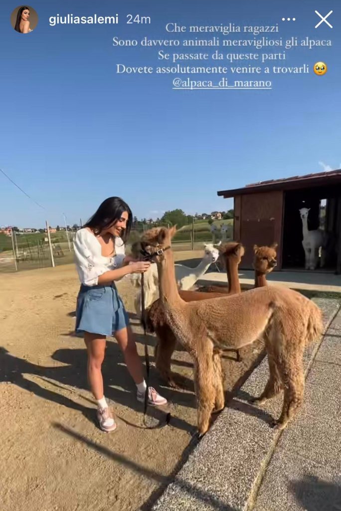 Tra le tante novità, prossimamente arriva in televisione anche la seconda edizione del suo format “Salotto Salemi”. Dopo il successo riscontrato nella prima edizione su Mediaset Infinity, Giulia ben presto sbarcherà in televisione per le nuove puntate del suo originalissimo format. In questa domenica estiva ha raggiunto la sua famiglia a Cremona per trascorrere alcune ore in loro compagnia. Giulia insieme alla sua sorellina Margherita hanno trascorso del tempo tra gli animali, dagli alpaca ai cavalli. Le sorelle Salemi si sono divertite insieme immerse nella natura. Giulia ha dichiarato: “Che meraviglia ragazzi Sono davvero animali meravigliosi gli alpaca Se passate da queste parti. Dovete assolutamente venire a trovarli”. Nel frattempo nei prossimi giorni tornerà a Milano per continuare a lavorare sui nuovi progetti prima di ripartire per le vacanze estive col suo Pierpaolo.