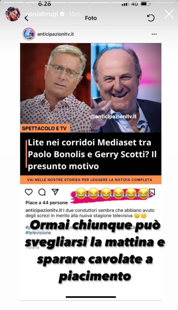 Nelle ultime ore Sonia ha condiviso una notizia di una presunta lite nei corridoi di Mediaset tra due nuovi conduttori televisivi. La notizia riportata da anticipazionitv.it, parlava di una presunta lite tra suo marito Paolo Bonolis e Gerry Scotti. La Bruganelli tra le sue stories Instagram ha scelto di condividere la notizia con uno screenshot e aggiungere la sua personale reazione. Sonia scrive: