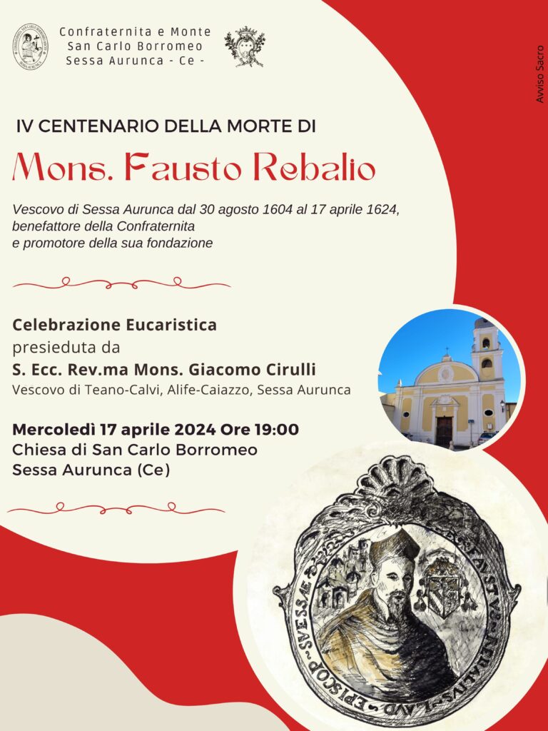 Mercoledì 17 aprile 2024, alle ore 19:00, presso la Chiesa di San Carlo Borromeo in Sessa Aurunca (Ce) si terrà la Celebrazione Eucaristica presieduta da Sua Ecc.za Rev.ma Mons. Giacomo Cirulli, vescovo di Teano-Calvi, Alife-Caiazzo e Sessa Aurunca, in occasione del IV Centenario della morte di Mons. Fausto Rebalio, Vescovo di Sessa Aurunca dal 30 agosto 1604 al 17 aprile 1624, benefattore della Confraternita e promotore della sua fondazione.